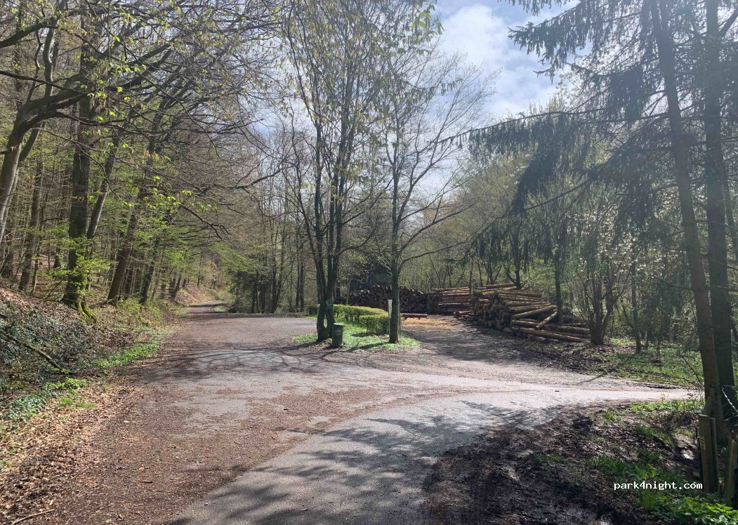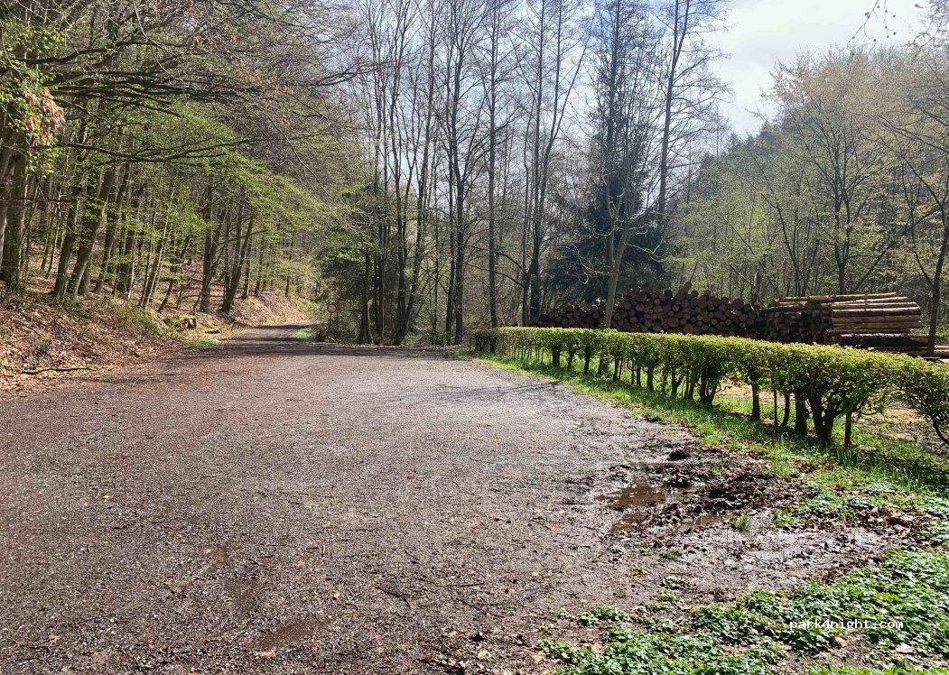 Hiking parking lot surrounded by trees. Ideal as a starting point for hikes. When you get to the square, the left half is suitable for parking. The right half is sometimes used to store wood. Walking traffic during the day, quiet in the evening/night. dustbin available.