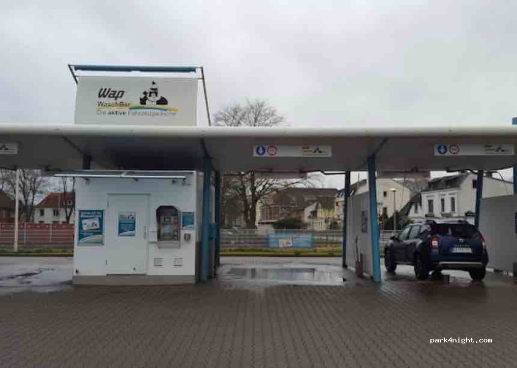SB-Waschanlage mit Brücke für Wohnmobile. Für das Waschen werden Coins benötigt, diese können per Barzahlung oder EC-Karte am Automaten erworben werden.