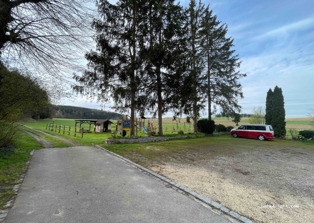 Hübscher sauberer Parkplatz mit Spielplatz am Waldrand. Wir wurden im Gasthaus sehr freundlich empfangen.