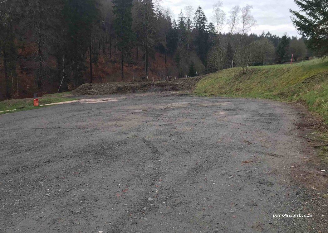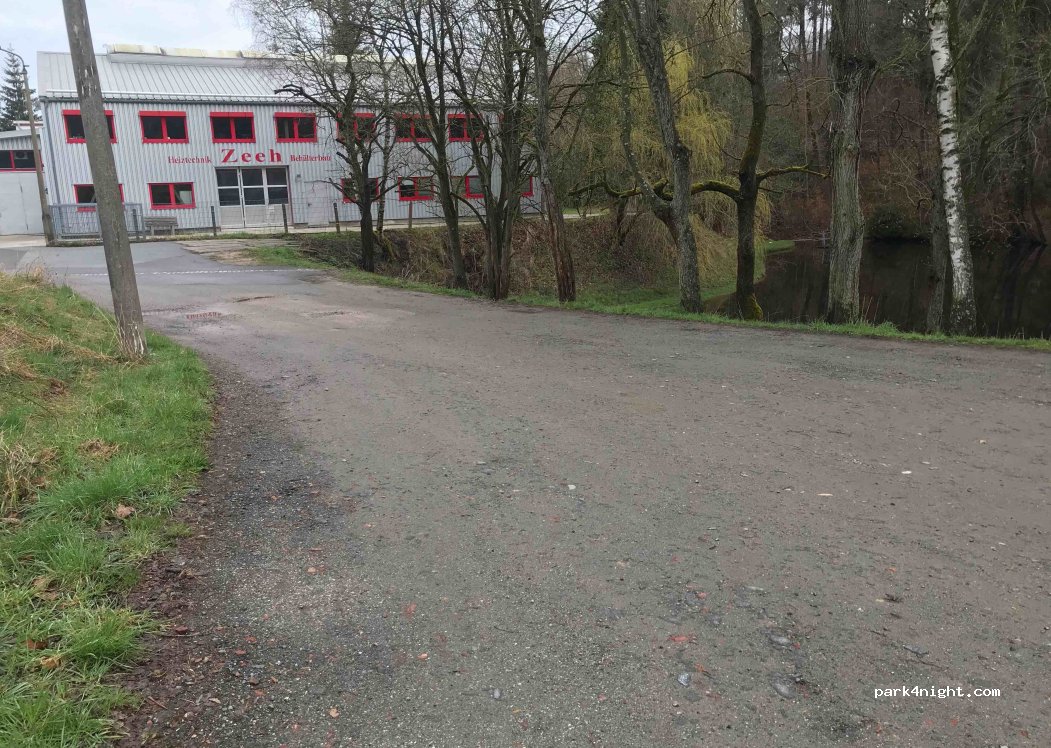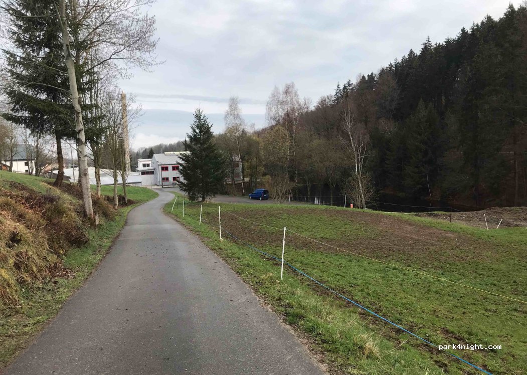 Parking at a pond outside of a town. Good starting point for hikes, including a village adventure trail. Spent a quiet night here. A few cars pulled up late in the evening, but the young people were probably visiting somewhere and were just parking. Also disco noise or similar was not to be heard, only the murmur of a stream.