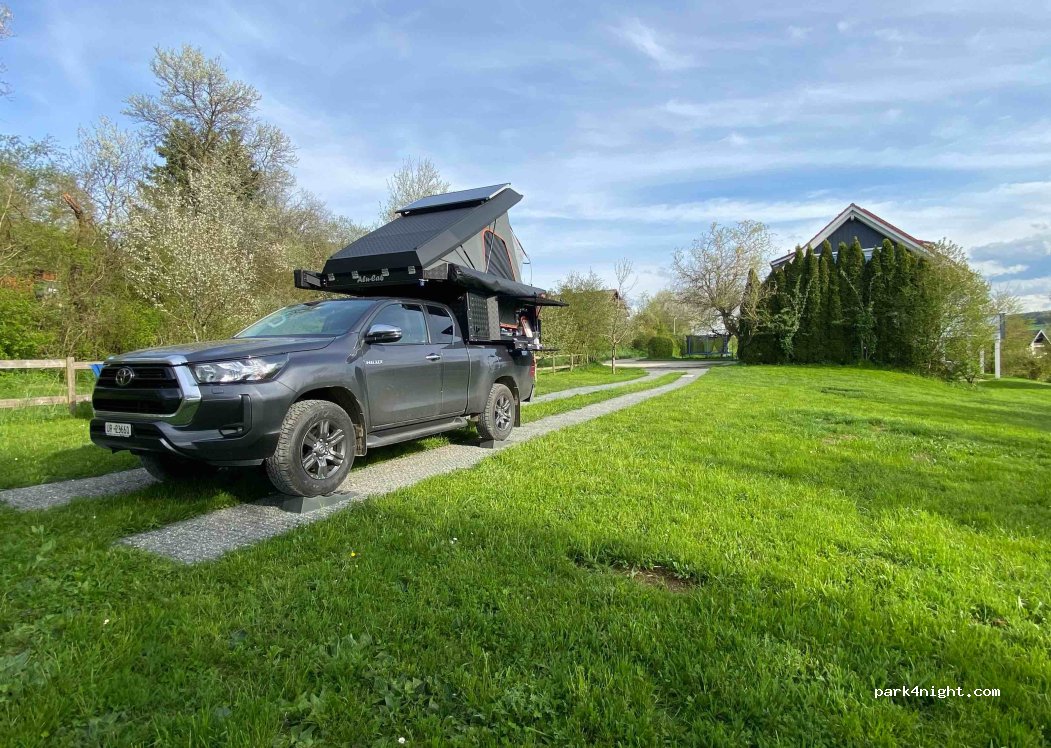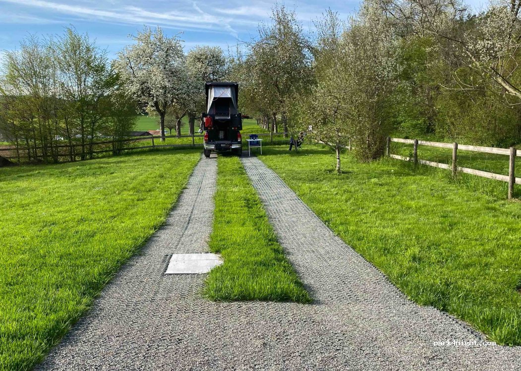 The well-maintained meadow, exclusively available to one camper, is part of the grounds of our house (formerly a forester's lodge), measures over 500 square meters, and is mowed weekly. Located on the outskirts of Engen (Konstanz district) (1 km from the center), it offers a unique view of Engen and the Hohenhewen mountain range. Since March 23: The pitch is now paved over a length of over 30 meters and can therefore be accessed easily all year round (see last photo). Due to their size, converted coaches will reach your/our limits when accessing it. Lake Constance is a 15-20-minute drive away, and the train (RE or Seehas) takes barely longer (Radolfzell - Engen from 19 minutes). The Rhine Falls in Schaffhausen can be reached by car in just under 30 minutes. A short hike to the Ice Age Park Engen or the new, extensive premium hiking trail "Hegau Vulkan Tour" can be started near the spot. You can also start your bike tour right from our house, for example, towards Lake Constance, on quiet back roads through beautiful nature. The aforementioned train connection is also a great alternative for the return journey. The Engen adventure pool is a 5-minute bike ride away. Despite our remote location, there are plenty of shopping options nearby (farm shop 400m, supermarkets 1-2km). You are welcome to use our private fire pit with a rotisserie grill or just the fire bowl. Drinking water can be bottled. Outside, there is hose access to our rainwater cistern. There is no toilet or shower on site. Both are available for a fee at the Hegau West rest area 400m away. Electric cars can be charged during the day at our wallbox in the carport for a small fee. A 230V outdoor socket in the carport can be used. Please call or write before arrival to check availability, as our spot can also be reserved through other portals. Unfortunately, advance reservations are only possible with advance payment (PayPal or bank transfer), as there are now people in this community who make reservations and simply don't show up without canceling. I hope for your understanding.