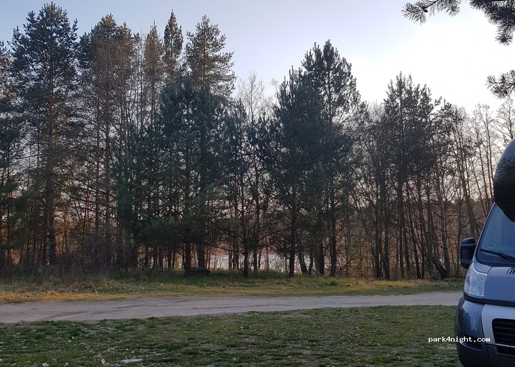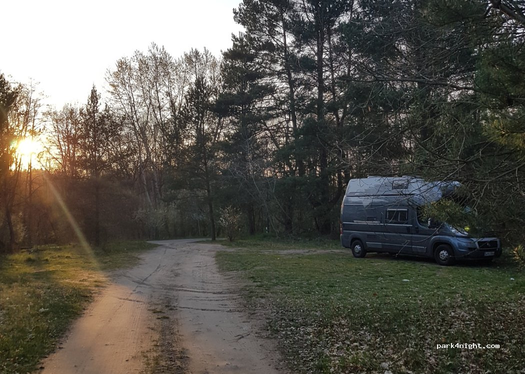 Kleiner Parkplatz im Wald, neben einer Straße. Nachts ruhig, nah am See und man kann im Wald spazieren gehen. Keinerlei Service.