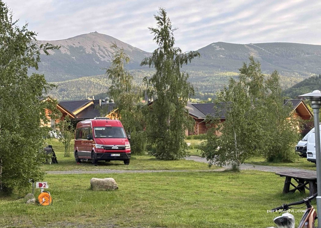 Świetny kamping z widokiem na Śnieżkę. Bardzo dużo miejsca w parceli, super restauracja oraz sanitariaty. Kamper + 2 dorosłych + 1 dziecko + prąd 140zł za dobę. Sanitariaty, uzupełnienie wody, zrzut wody szarej i czarnej w cenie. Polecam robić rezerwację.