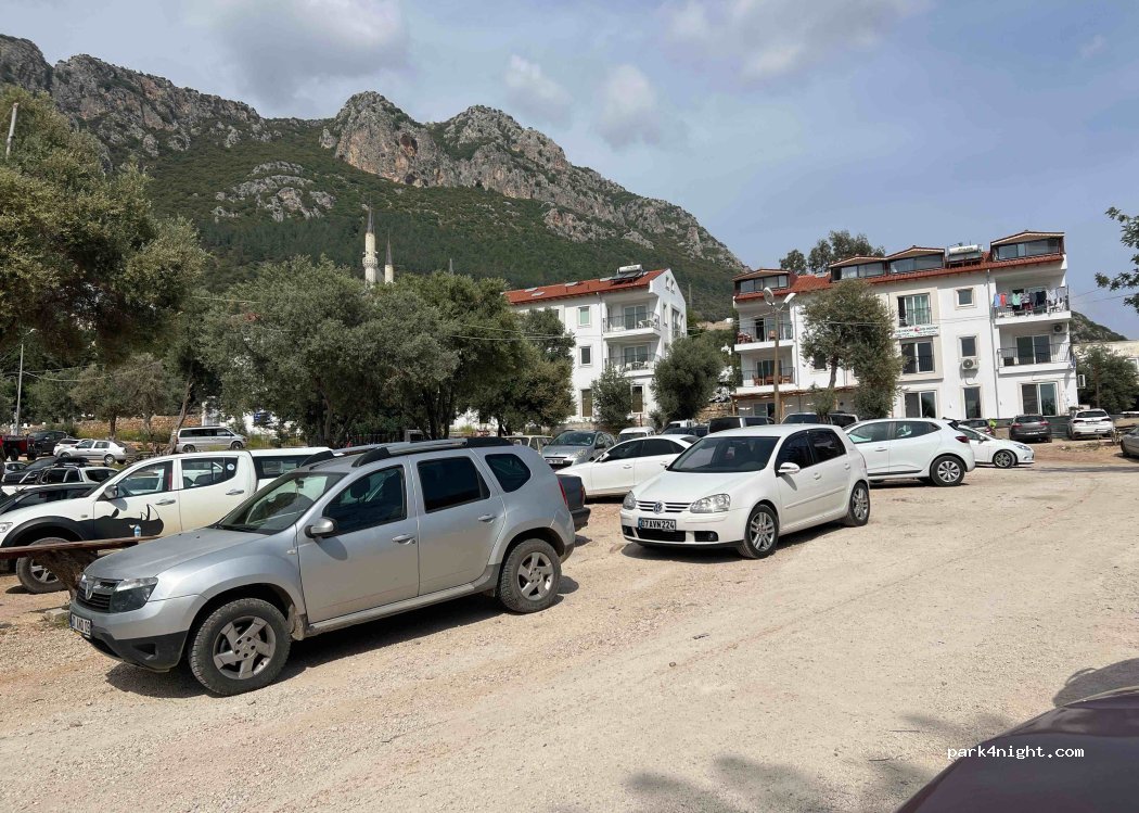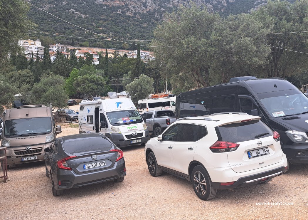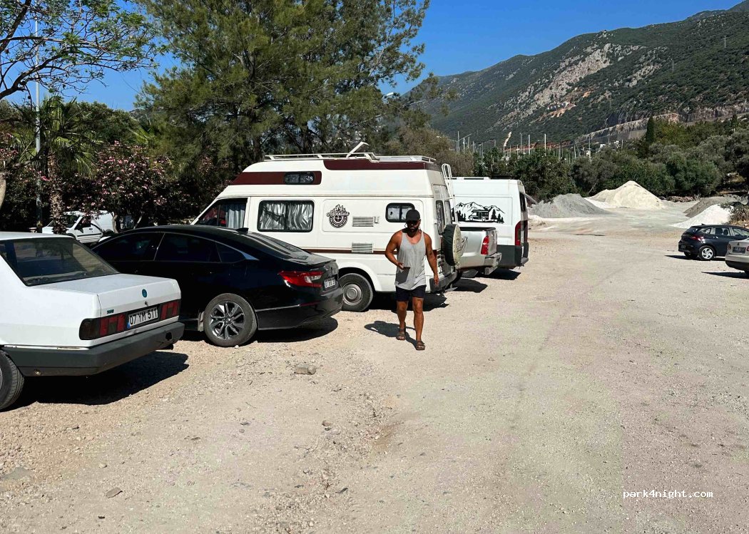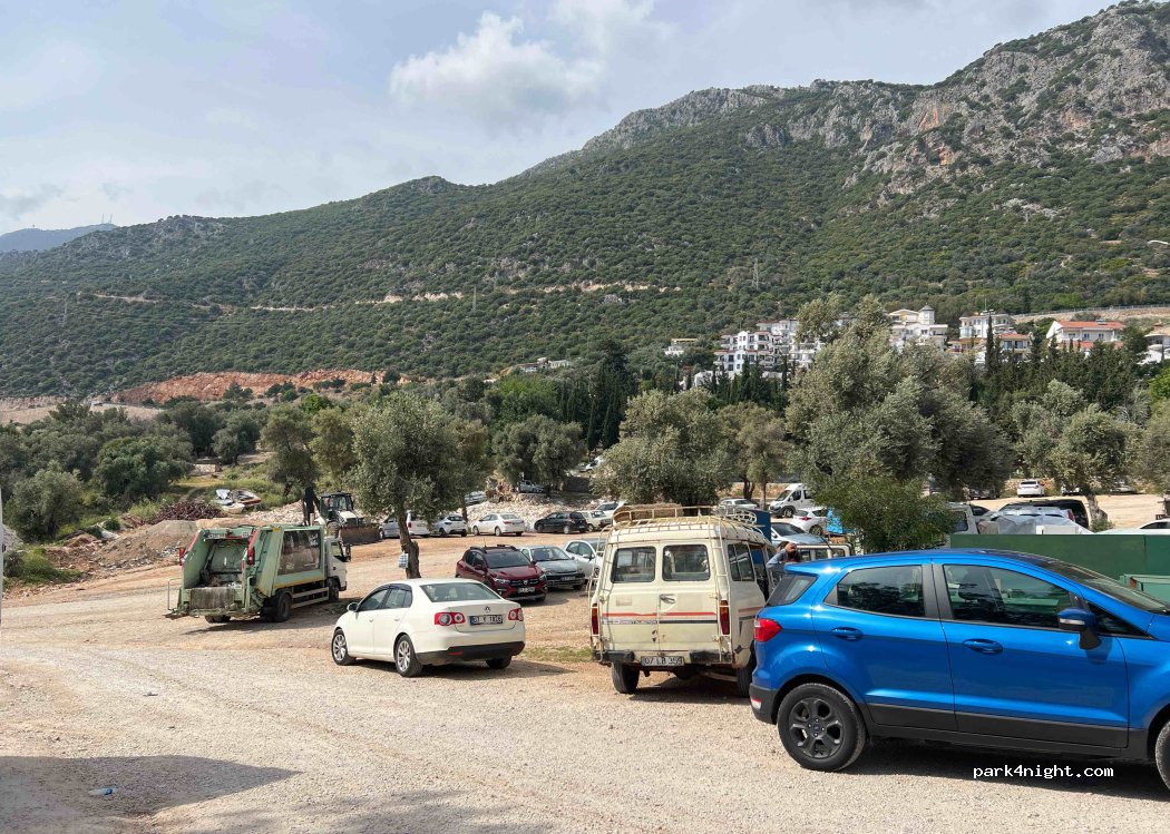 Grande parcheggio per automobili, con possibilità di posteggiare camper di grandi dimensioni (arrivando all’ora giusta). C’è un po’ di movimento fino a mezzanotte, poi diventa tranquillo. Uno dei pochi spazi non a pagamento a Kas!! Consigliato per massimo una notte
