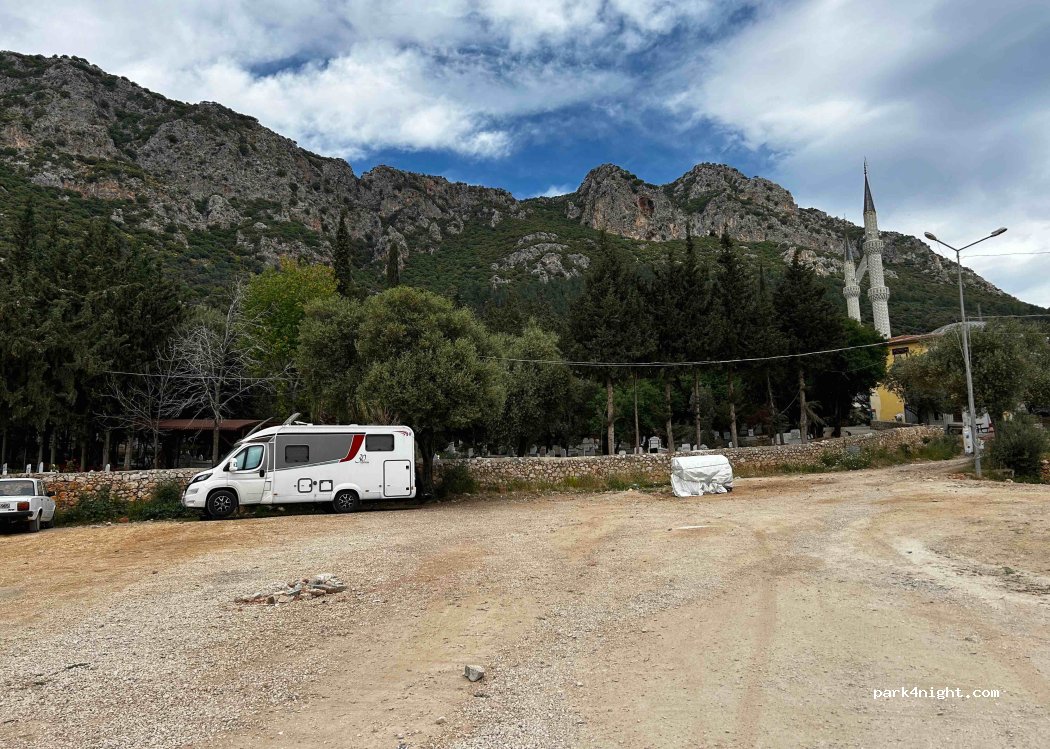Enormous car park. Very basic but perfect for an overnight stop & to explore Kas. Managed to find a relatively flat spot. Very little noise.