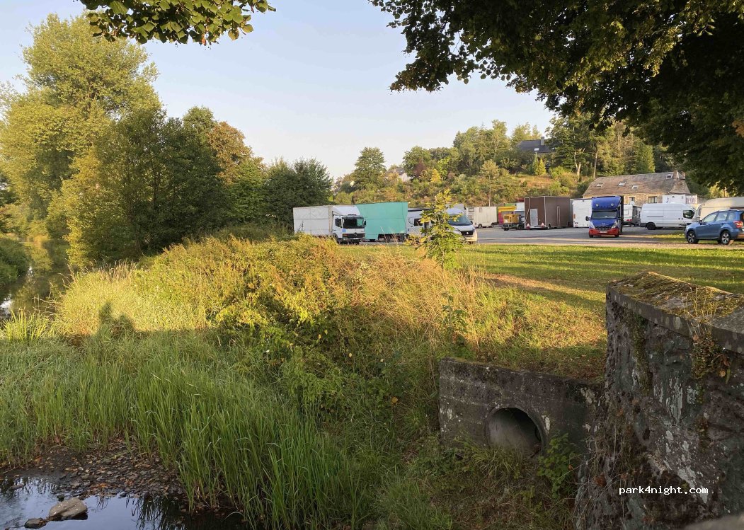 Prima plek voor een overnachting! Wij stonden op een donderdagavond. Er stond nog 1 vrachtwagen geparkeerd, verder leeg veld. De supermarkt Delhaize is op 1200 m. Uitgebreid assortiment en het dorp is prima te belopen.