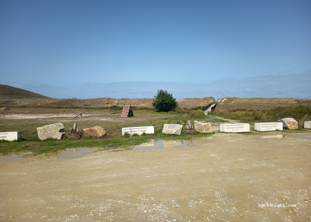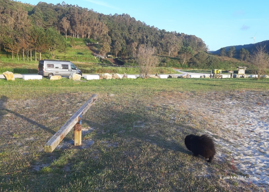Aparcamiento en preciosa playa. Con zona de mesas y churrasqueros para poder comer. Con posibilidad de realizar rutas de senderismo. Lugar bonito, tranquilo y bastante concurrido de AC y Van, al menos en Semana Santa (momento en el que lo hemos visitado). No existe zona de servicios.