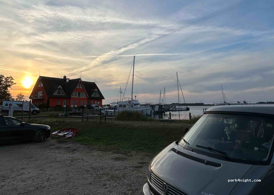 Parking spaces right next to the small marina with a direct view of the lagoon. Toilets and showers very well maintained. Electricity must be obtained from the stations for the boats. There is a water connection near the building. Payment to the very nice harbor master in the building. Due to the port operations there is often something going on, but otherwise a relaxed parking space for a stopover or a night. Modern houseboats and a license-free boat can be rented on site. Perfect access for wading anglers. There is also a small playground right next to the parking space.
