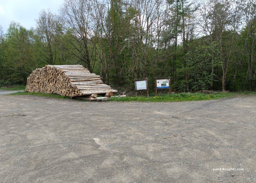 Der Holzstapel auf dem Foto ist nicht mehr da. Volles 5G Netz Vodafone. Der Parkplatz wird wenig angefahren, die Straße kaum befahren.