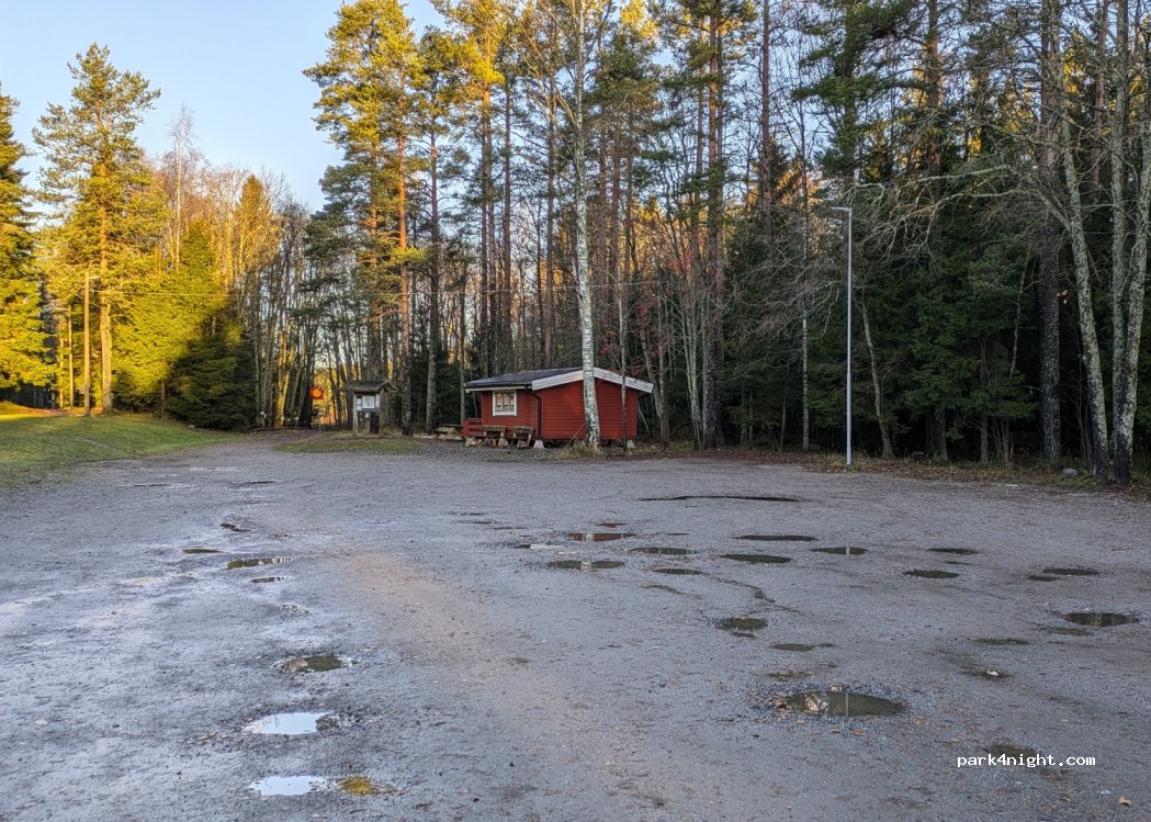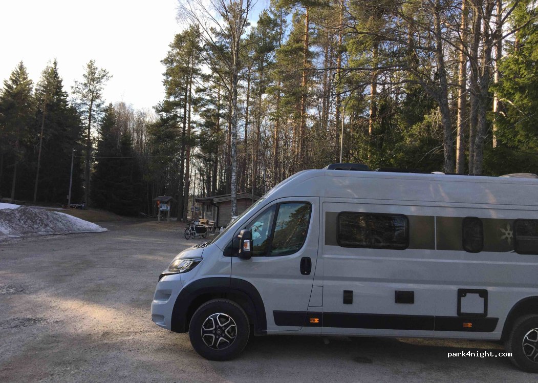 Parking plat en dur avec gravillons calme dans l'ensemble. C'est un parking d'un parc forestier où quelques locaux viennent s'y rendre en journée. Le soir, quelques jeunes. Le parking n'a rien d'exceptionnel, pas de service. Très bien pour une nuit si vous ne voulez pas vous éloignez de la E4. Calme dans l'ensemble. Jolie balade à faire. Le terrain du parc est aussi propice pour une tente.