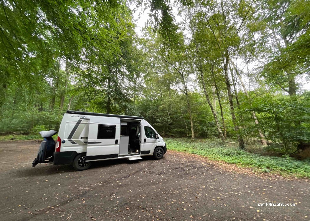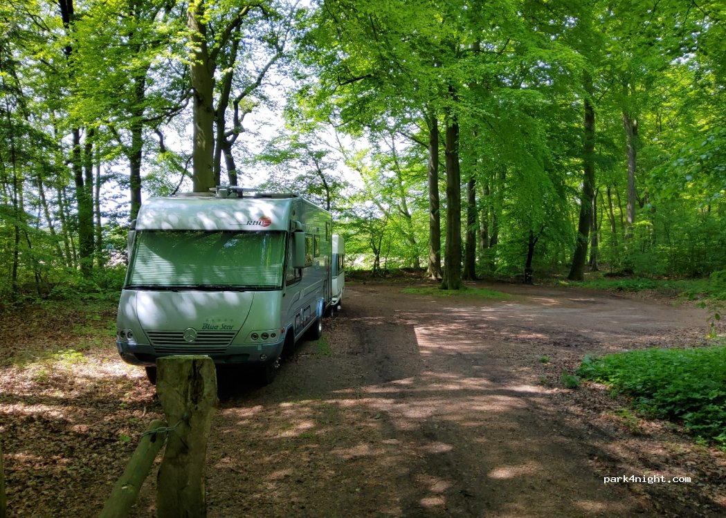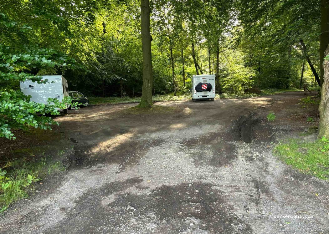 Petit parking caché, ombragé et calme sous les hêtres centenaires et les pins. À environ 200 mètres de la route de campagne et à environ 20 mètres d'une petite route de village peu fréquentée. Il y a assez d'espace pour 3 mobil-homes. poubelle à disposition. Quelques randonneurs et marcheurs.