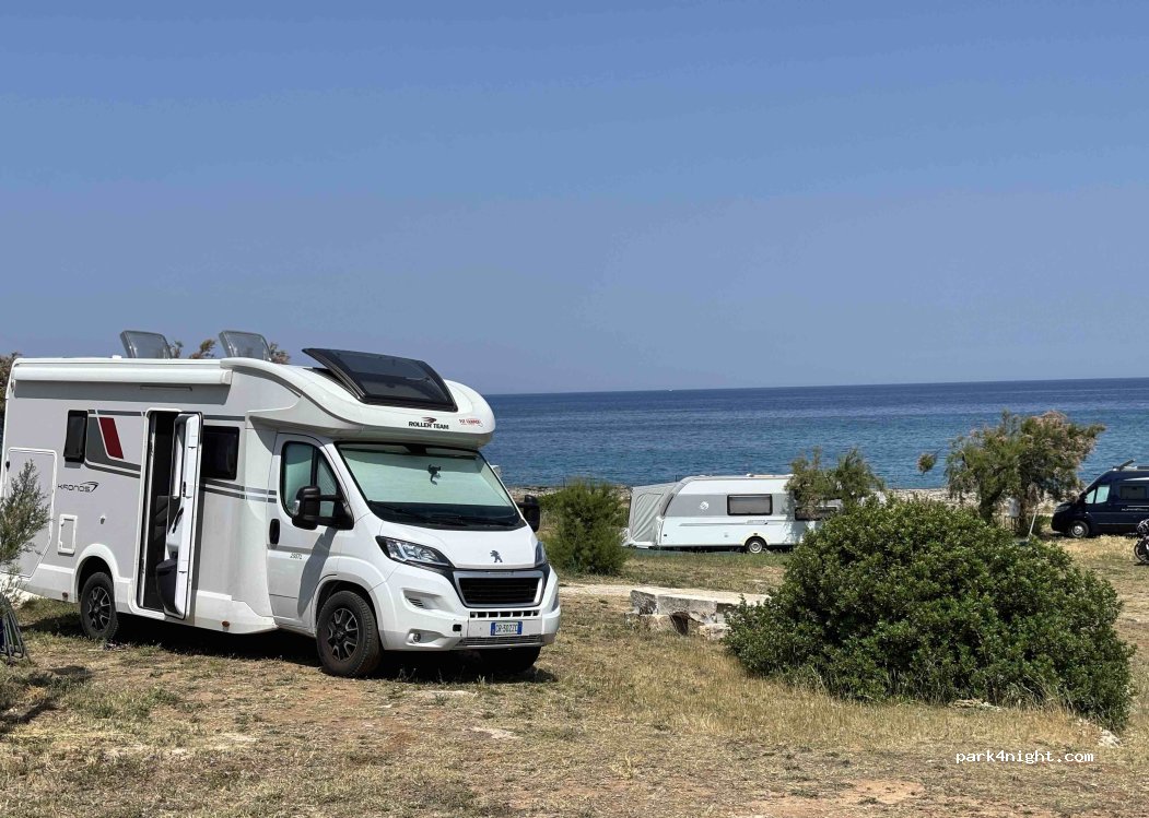 Bel emplacement face à la mer. Baignade dans crique privative. Sanitaires propres et fonctionnels. Possibilité de lessive. Calme. Bar à l’entrée du camping et minimarket. Douches chaudes payantes mais non indispensables en juin . 24€ pour une nuit avec camper sans électricité et 2 personnes. Camping très agréable dans les Pouilles.