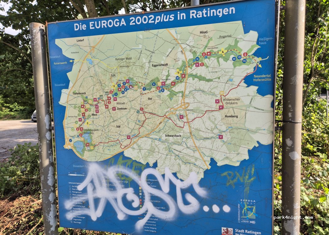 A large car park, level and off the main road. No height restrictions. No facilities, you need to be self-sufficient Easy 20 min walk from the Town centre, with public transport to get to Dusseldorf. It is used as a coach park - we woke up to 15 coaches and 300+ children. some children jumping on our rear step! 1st photo show the parking next to this one - that has height restrictions.
