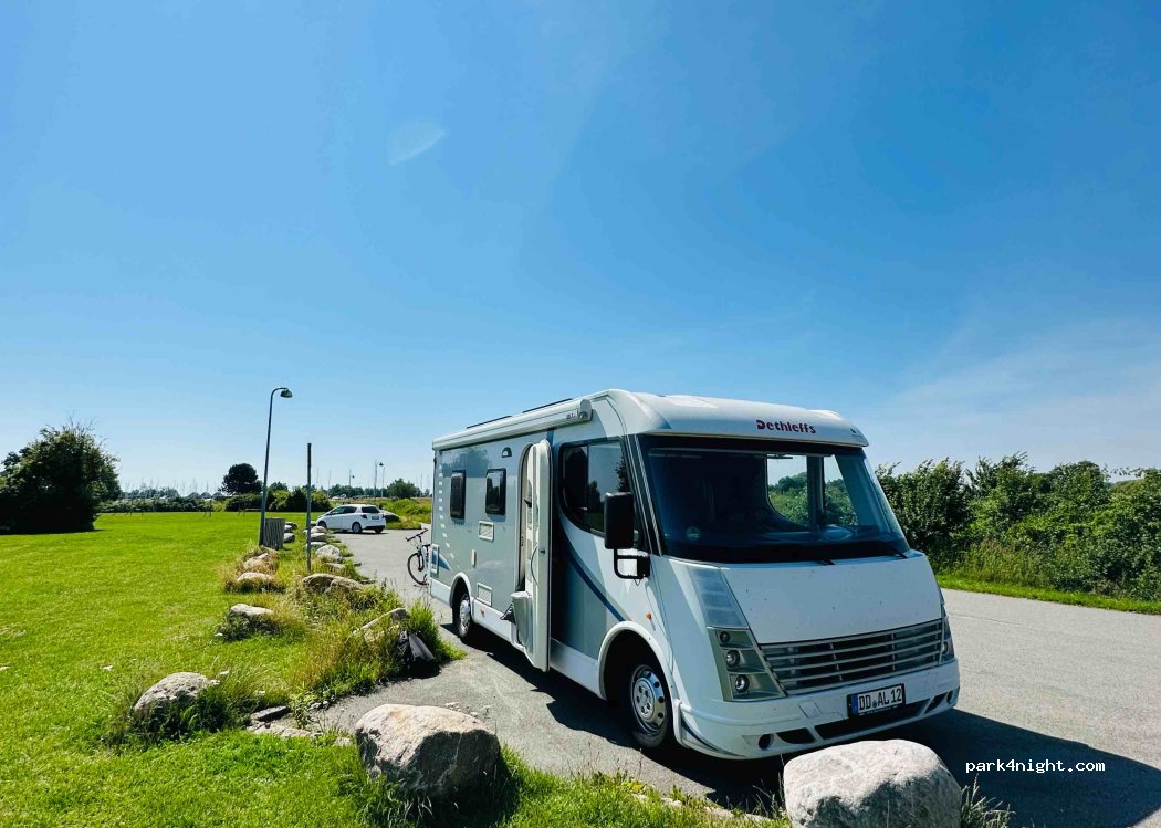 Schöne Aussicht, ruhiger Parkplatz. Sehr nah am Hafen. Mülleimer vorhanden. Bahn Fußläufig.