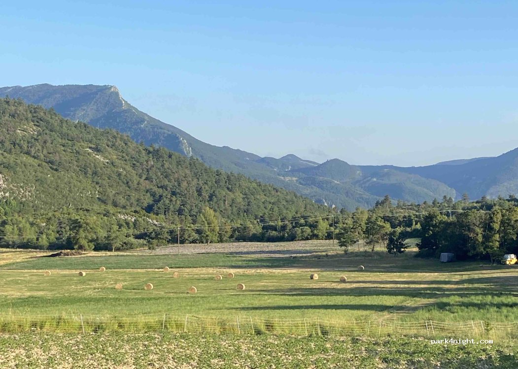 Camping ,,Ferme du Cheiron“. Super quiet, 5 min. walk to the lake. There is a kiosk and boat hire at the lake. Nice owner. Toilet, shower, electricity and washbasin available and clean. A place for nature lovers. If you are looking for a campsite with pitches, white motorhome fronts and entertainment, this is not the place for you.