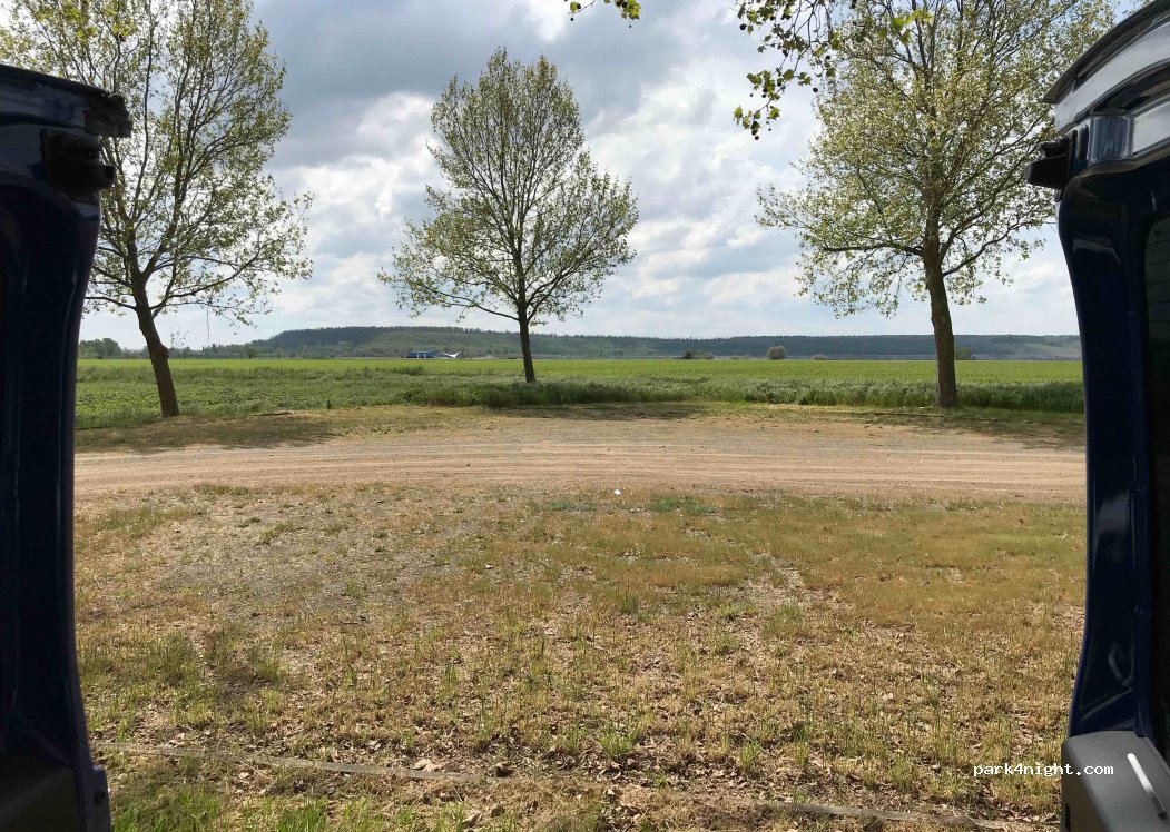 Ein sehr schöner, großer Parkplatz mit schöner Aussicht über die Felder und Baumschatten. Nachts angenehm ruhig, da keine Straße in unmittelbarer Nähe vorbei führt.