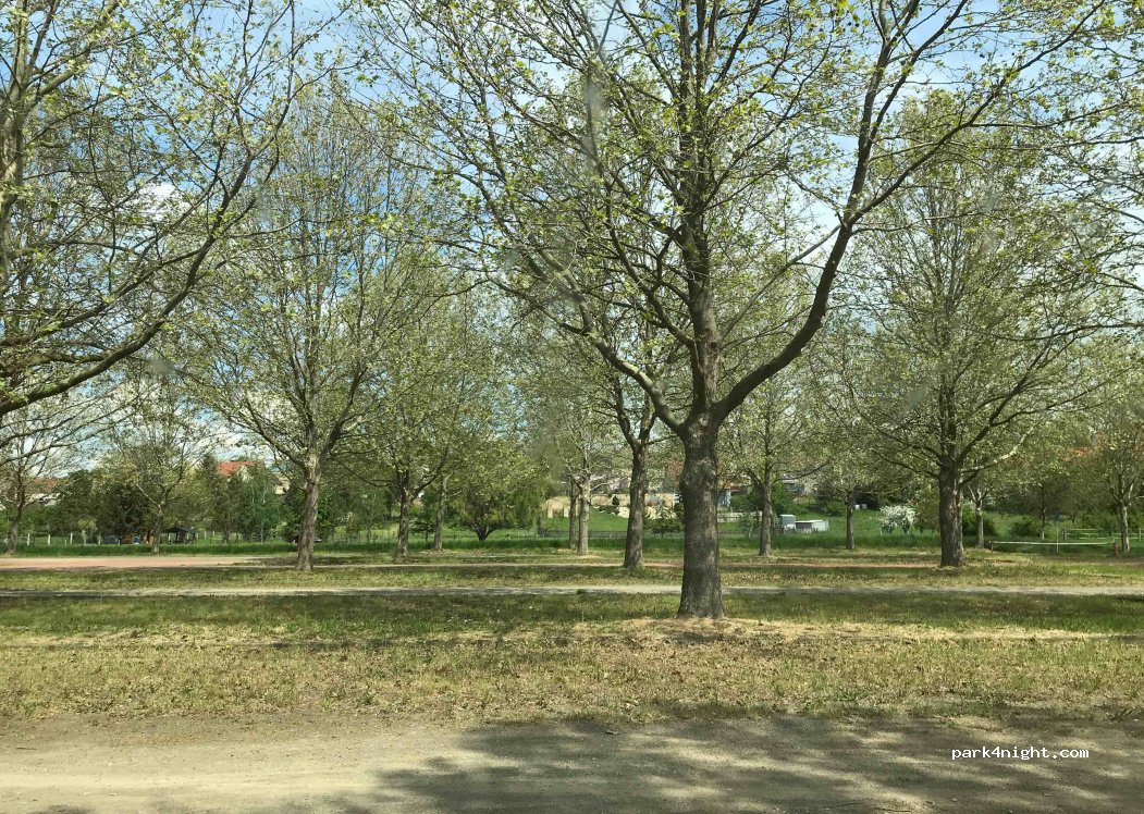 Großer Parkplatz unter Bäumen mit ausreichend Platz. Nachts angenehm ruhig.