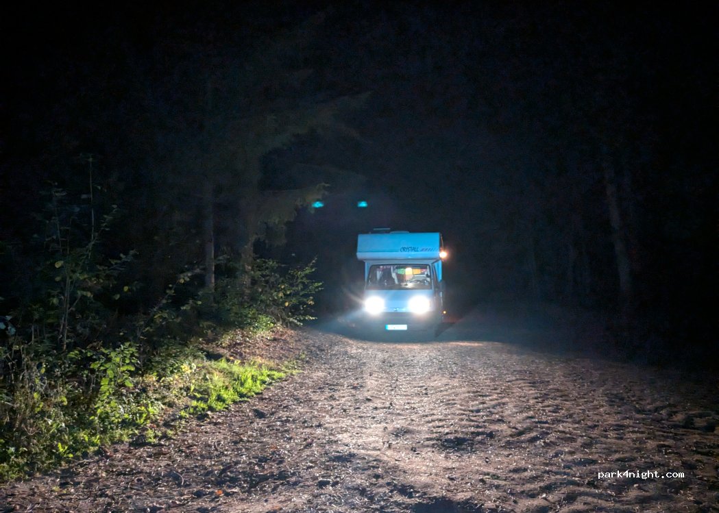 Parking de randonnée en forêt le long d'une large route. Des panneaux clairs sur la route principale, il s'agit d'un parking officiel de randonnée. La route fait environ 12 mètres de large et des deux côtés un camping-car peut être garé avec encore assez de place pour que les voitures passent. Les côtés de la route sous un petit angle. Si vous voulez rester au niveau de l'eau, cherchez un autre endroit