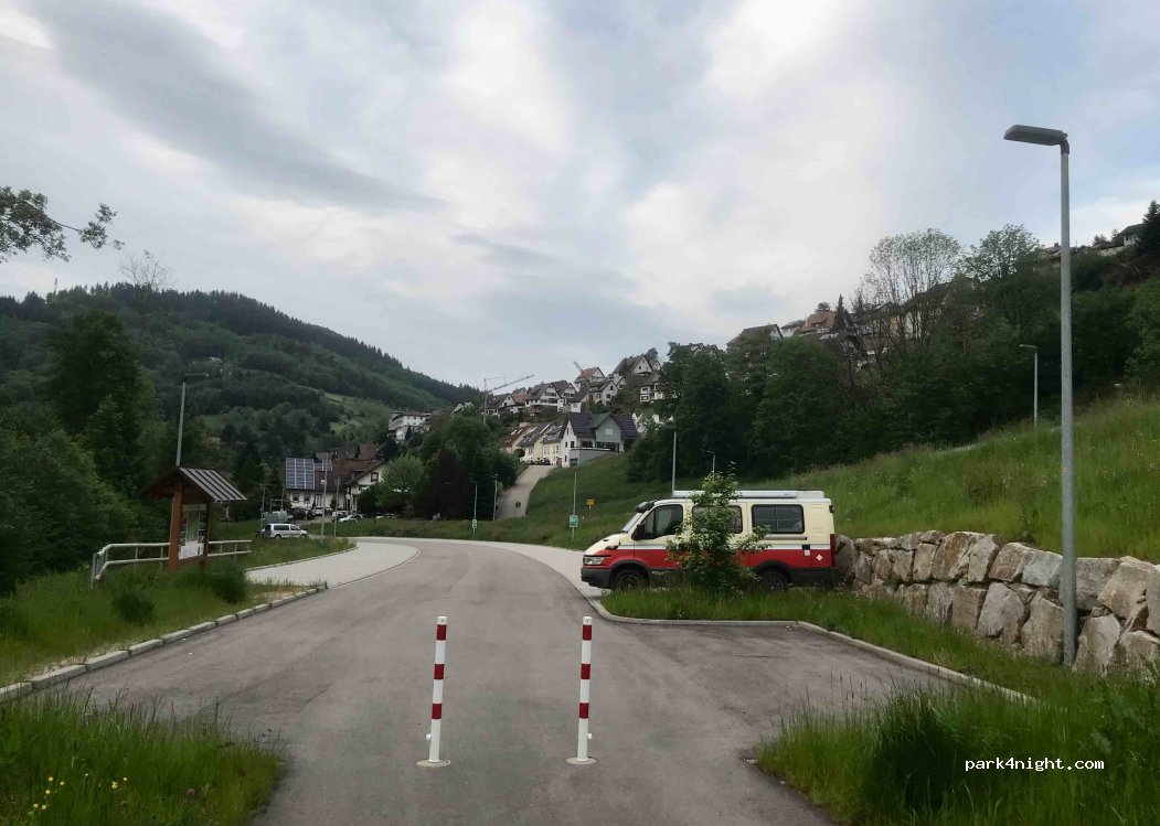 This is a new parking lot on the outskirts of the town - marked P4 Naturerlebnisbad. There’s a height restriction of 2.4m. Very clean WC at the train station a 5 minute walk into town. Lovely bakeries and shops in the town and the departure point for many amazing hikes in the local area.