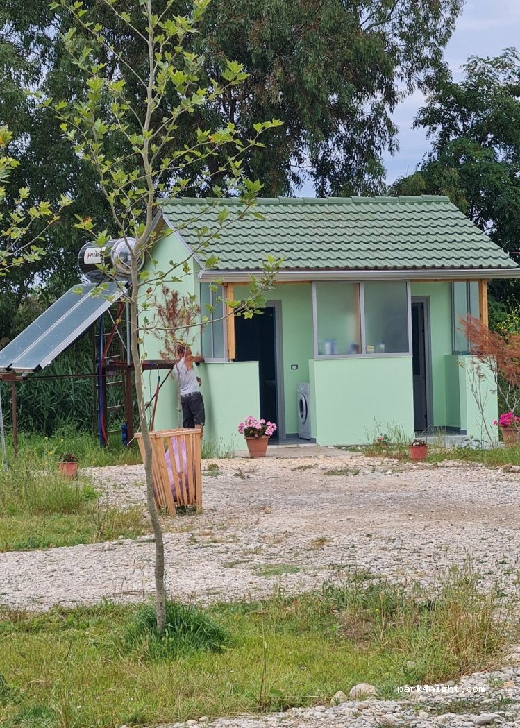 Apolonia Camping has the spanking clean bathrooms with hot showers, free and fast WiFi , pretty views of surrounding hills with olive groves, super nice owner and it is 15 min walk from the archeological site of Ancient Greek city of Apolonia. Peaceful and quiet. For €15/n it’s a bargain. Oh, and they are building an outdoor kitchen!