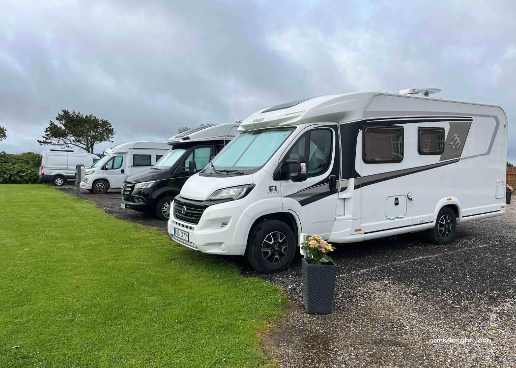 Stellplatz für die Wohnmobile auf Schotterplatz direkt an der Straße, daher ist es recht laut. WLan top, auch die Sanitäranlagen auf dem Campingplatz sind schnell erreicht.