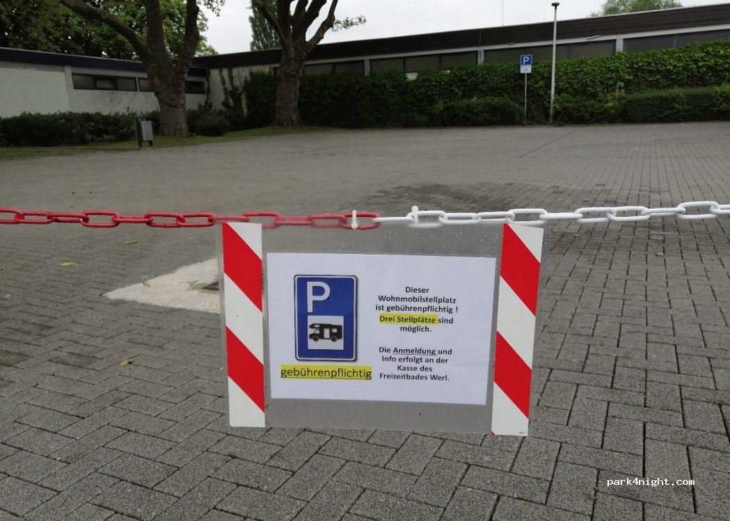Offiziell ausgeschilderter Wohnmobilstellplatz, zu bezahlen an der Schwimmbadkasse zu deren Öffnungszeiten. Weitere Informationen auf der Internetseite der Stadt Werl