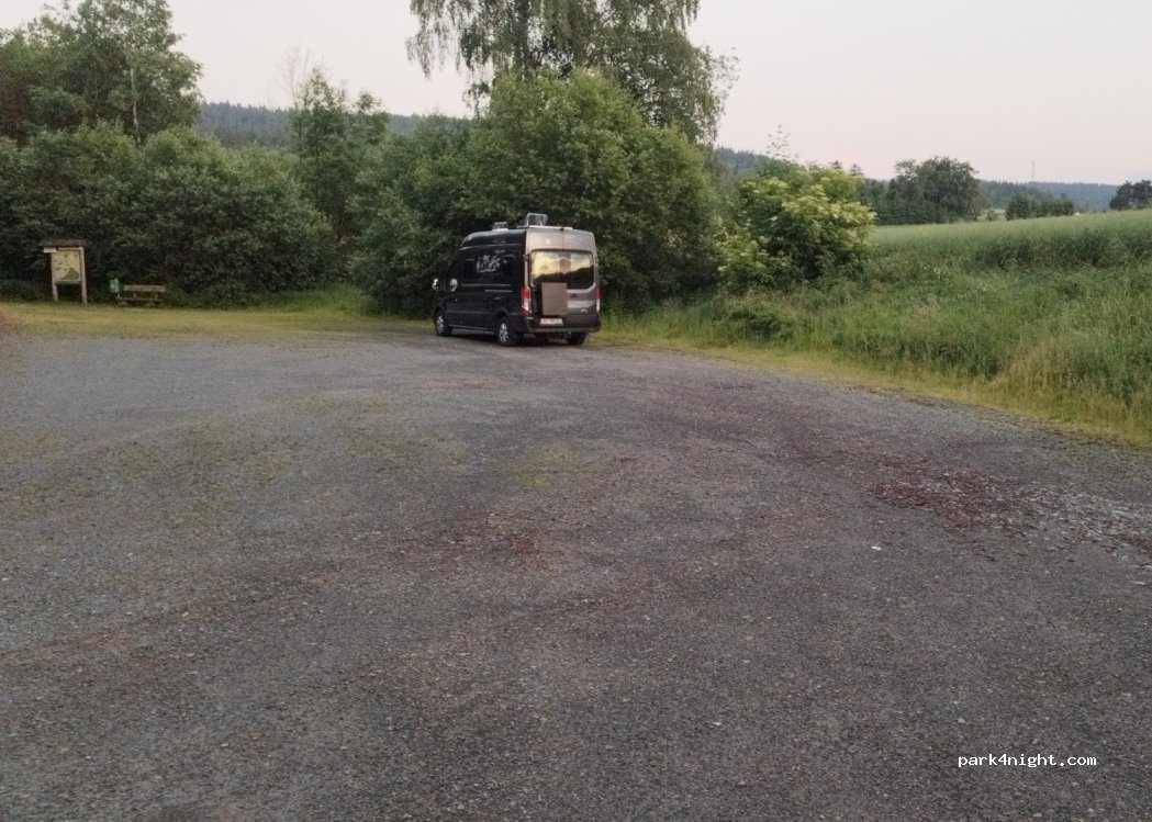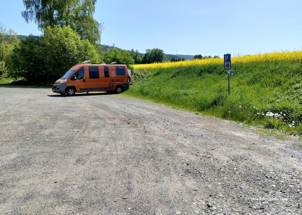Schöner Platz zwischen Feldern und Wald. Nebenan ist ein Sportplatz, wenn dort eine Veranstaltung ist wird's sicher voll. Ich stand hier ganz allein, ganz selten kommen Spaziergänger vorbei. Die Straße ist ein gutes Stück entfernt und nur ganz leise zu hören. Es gibt einen ausgeschilderten Rundwanderweg.