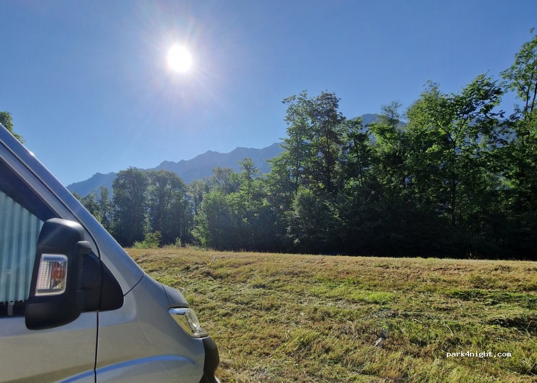 Seule la moitié droite du parking est interdite la nuit, pas la moitié gauche. Les flèches sur les panneaux de chaque côté de la zone limitée sont très explicites. Pistes cyclables en été, pistes de fond en hiver. Lieu très calme mais bruit du torrent et du train de temps en temps. Balade canine sur la route sans issue.