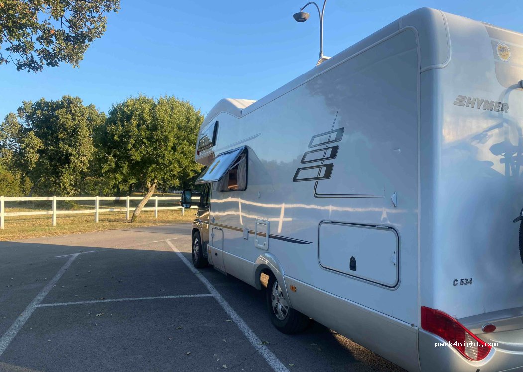 Wir waren spontan als Familie zu viert über Nacht hier und waren voll zufrieden. Der Parkplatz liegt ruhig innerhalb eines großen Gestüts. Wir hatten und in der Nebensaison bei der Rezeption des angrenzenden Hotels gemeldet. Wir durften kostenfrei übernachten. Gleich in der Nähe ist eine schöne Parkanlage mit Spielplatz und Picknickbänken.