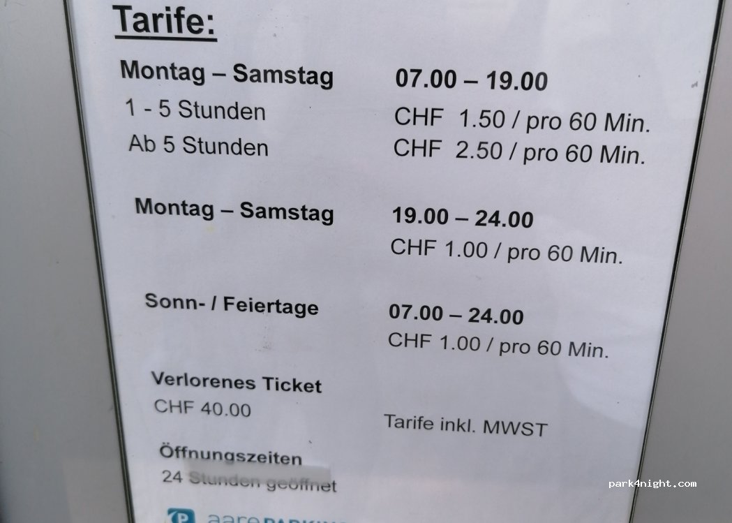 Posto con tante macchine ma di notte vuoto e abbastanza tranquilo. Prezzo dalle ore 21 alle ore 16 del giorno prossimo 16.00 chf