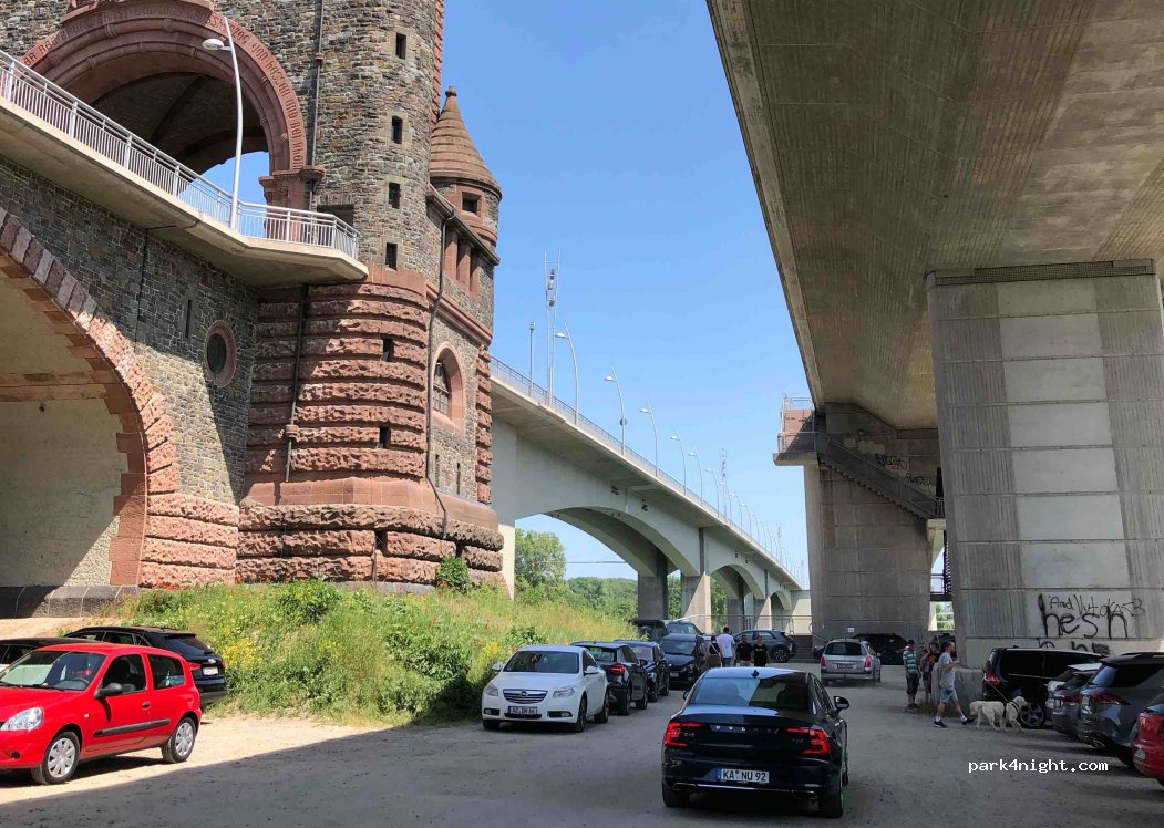 Parking space under a bridge, free of charge, right on the banks of the Rhine, restaurant and beer garden just around the corner. Center about 20 minutes walk. By bike in 5 minutes
