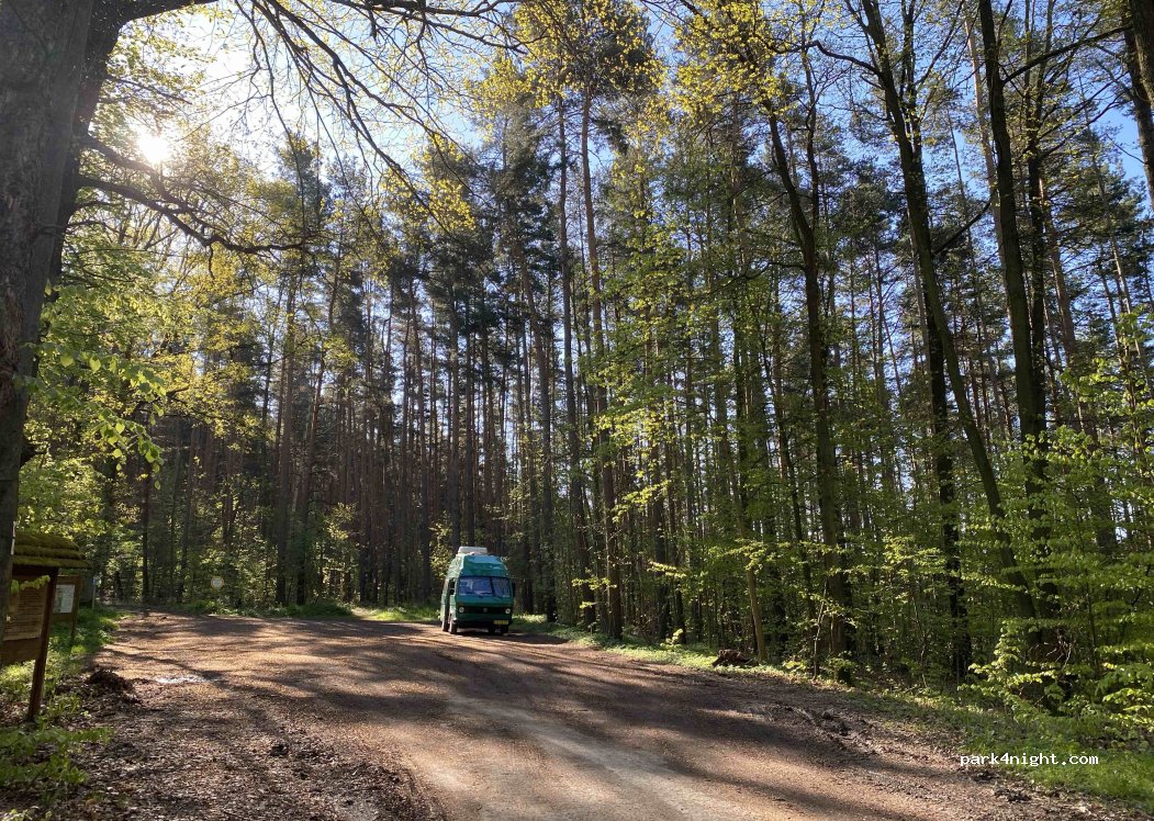Ein Wanderparkplatz im Wald, nahe einer Straßenkreuzung. Ebener Platz. Von hier aus gehen Wanderwege in den Wald.