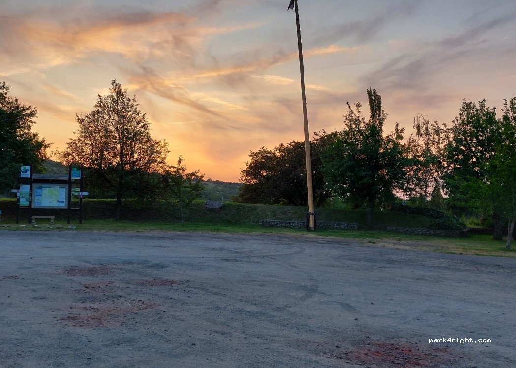 Am Ortsrand auf einem Wanderparkplatz, der liebevoll gestaltet ist. Mit wunderschöner Tauschbibliothek. Tisch und Bänken zum Zeit im Freien genießen. Tolle Aussicht auf Wälder, Wiesen und Hügel. Tagsüber sehr beliebt bei Wanderer, in der Nacht aber wunderbar ruhig.