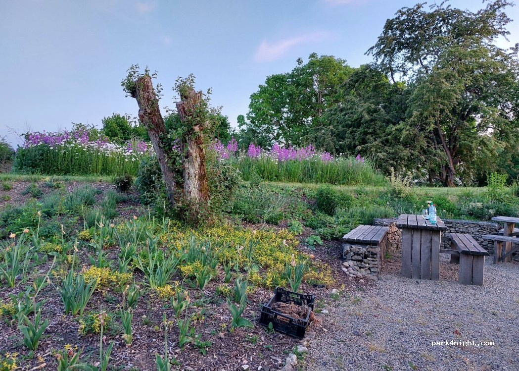 On the outskirts of a hiking car park, which is lovingly designed. With a beautiful exchange library. Table and benches to enjoy time outdoors. Great views of forests, meadows and hills. Very popular with hikers during the day, but wonderfully quiet at night.