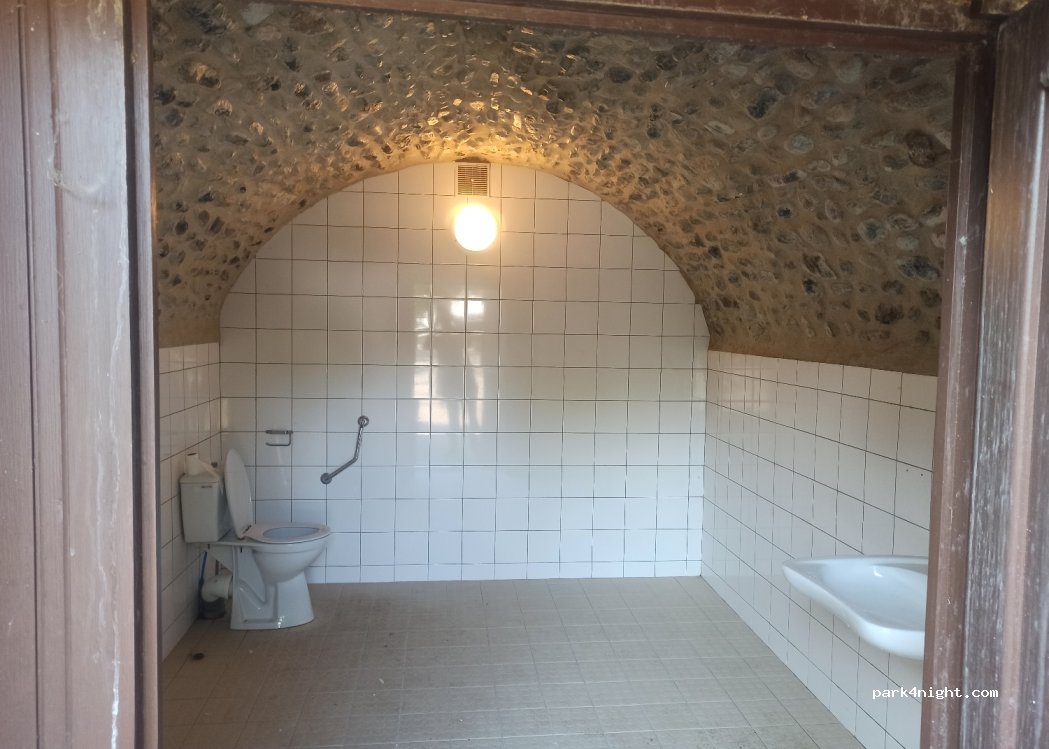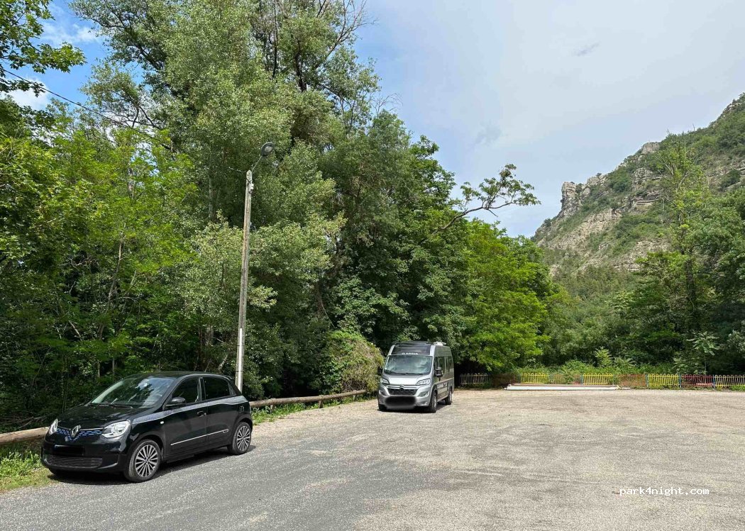 Très belle endroit ou on peut stationner tranquillement avec beaucoup d'espace et terrain bitumé/gravilloneux plat, wc, poubelles, point d'eau à proximité, le soir c'est éclairé. Et surtout juste à côté d'un lieu magnifique ou on peut se promener, beaucoup d'arbre, de flore et une rivière avec une jolie vue sur de petites cascades, l'accès est facile, il y a juste un petit pont assez étroit.