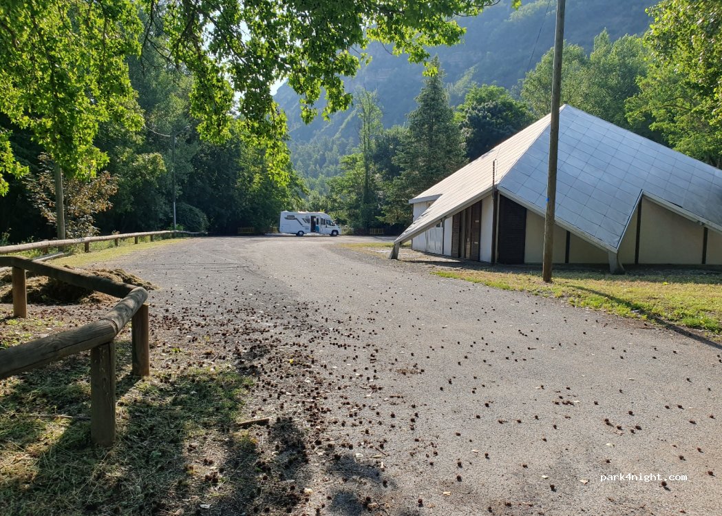 Großer, flacher Parkplatz am Fluss, hundert Meter von den Geschäften entfernt (Lebensmittelgeschäft, Bäckerei, Pizzeria). Ruhige Gegend, außer vielleicht ein paar Abende mit dem Gemeindehaus nebenan. Öffentliche Toiletten und Park in der Nähe.