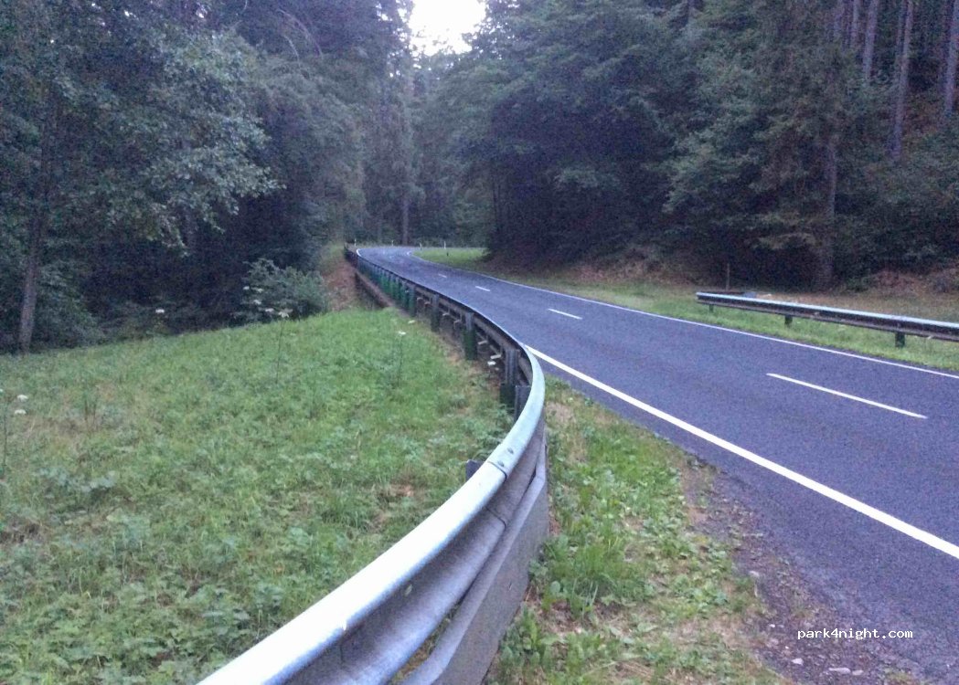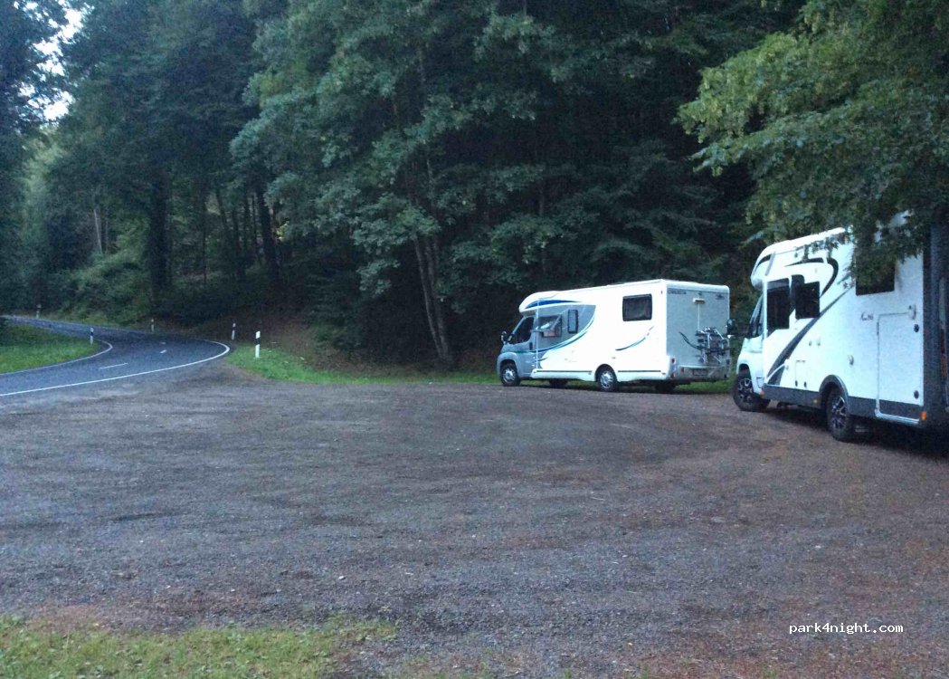 Picnic area (one table available). Start of the hike (Mullerthal trail). Space for several cc. Quiet road at night. Pleasant spot for one night.