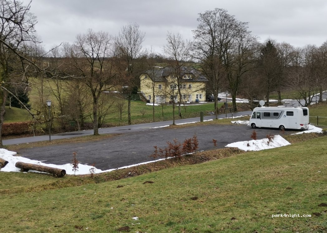 Von hier aus kann man wunderschön den Eifelsteig wandern, z.B. "Toskana der Eifel", Kalvarienberg Alendorf, Lampertstal. Entsprechend kamen tagsüber auch öfter am Parkplatz Wandernde vorbei. Der Platz ist groß, eben, recht ruhig (Landstraße nur bei offenem Fenster leicht hörbar, nacht gar nicht). Die Kapelle ist schön. Kleiner Mülleimer vorhanden.