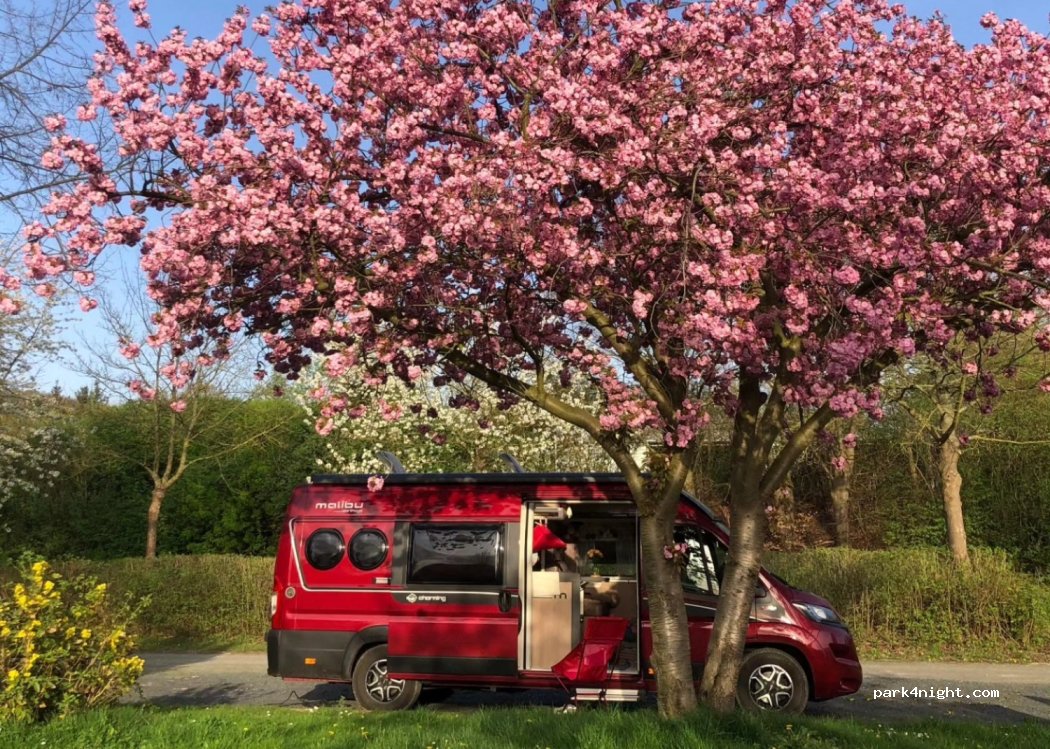 Schöner Platz, jetzt im Frühling mit toller Zierkirsche. Leicht abschüssig. Die Züge der Eisenbahn sind zwar wahrnehmbar, aber recht leise im Gegensatz zur Dorfjugend, die stundenlang im Minutentakt mit ihren laut knatternden Mopeds am Stellplatz entlang fährt. Nachts aber alles ruhig.
