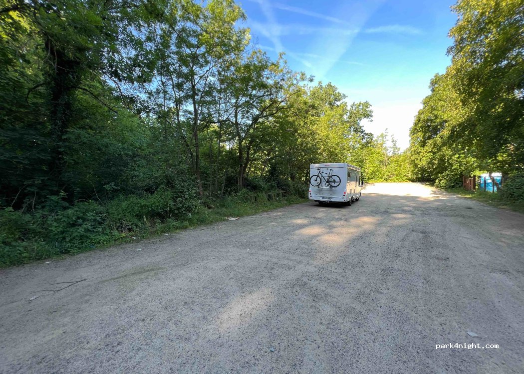 There is a parking lot in the forest. Very easy to reach with a camper van (not for trucks) and absolutely quiet at night. Airplane noise until 11pm...not too much if you're used to it...but absolutely quiet. For me, the best alternative in this Frankfurt area.