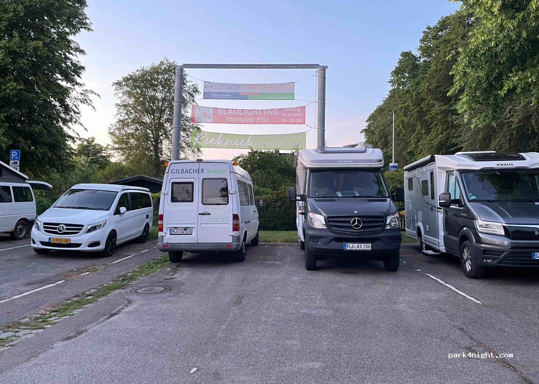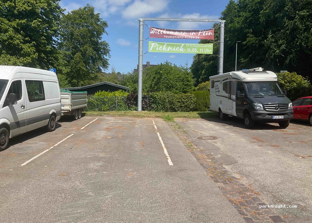 4 kostenfreie Stellplätze- auch für größere Wohnmobile geeignet. Direkt an der Hauptstraße, Entsorgungsanlage hat funktioniert- Grauwasserentsorgung nur mit Schlauch möglich. Direkt am See. Stadt, Schloss und Prinzeninsel gut zu Fuß erreichbar.