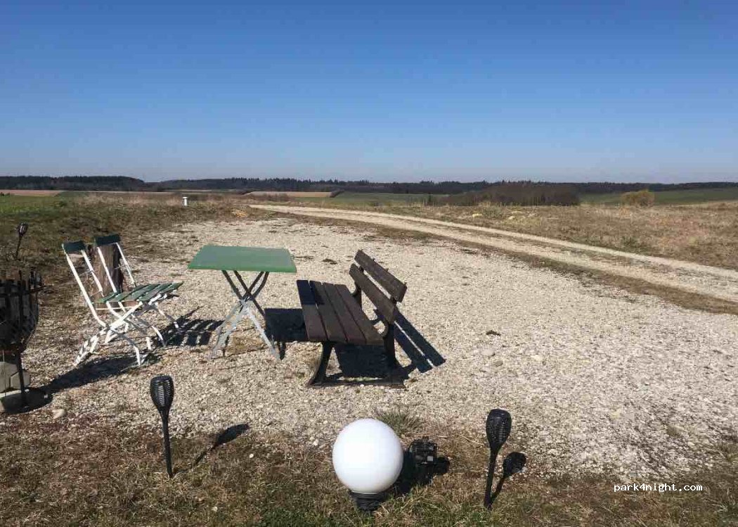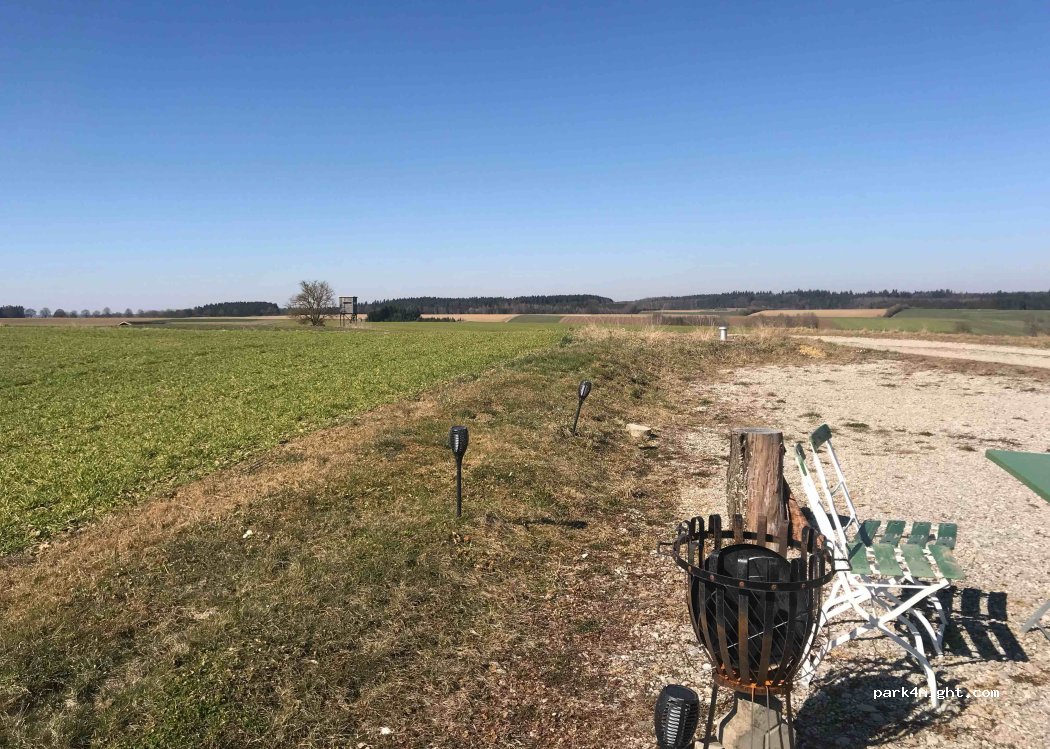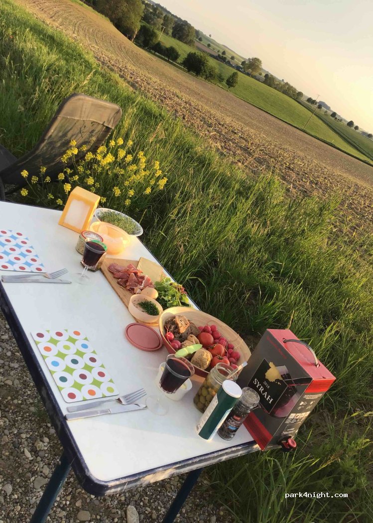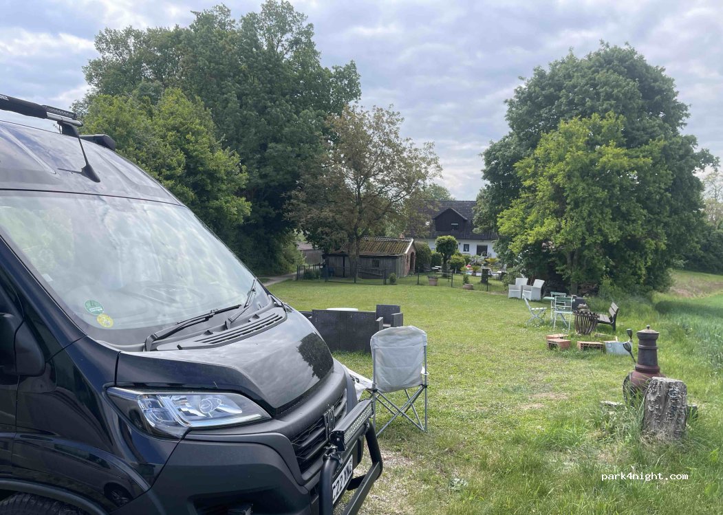 Sehr schöner Stellplatz mit Blick auf weite Felder und den Sonnenuntergang. Stühle und eine kleine Feuerstelle dürfen benutzt werden. Durften spontan vorbei kommen und hatten den Platz für uns alleine. Gerne wieder :)