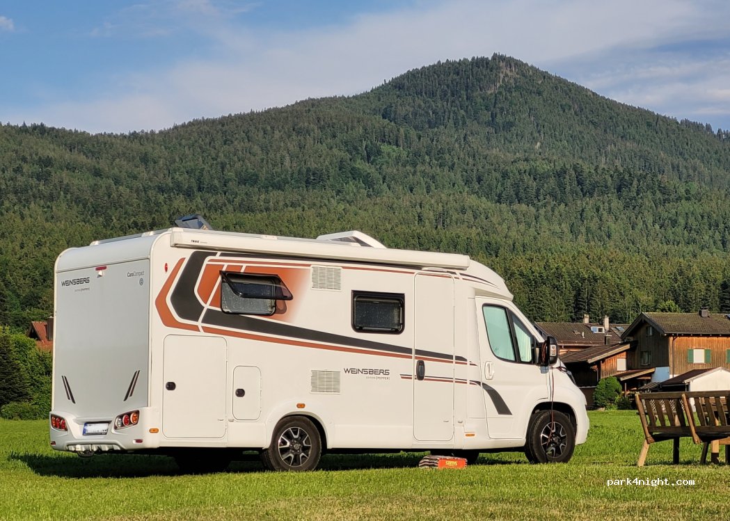 Camping dans une ancienne ferme du Chiemgau. Belle place de parking en bordure d'une prairie herbeuse avec vue sur la montagne.