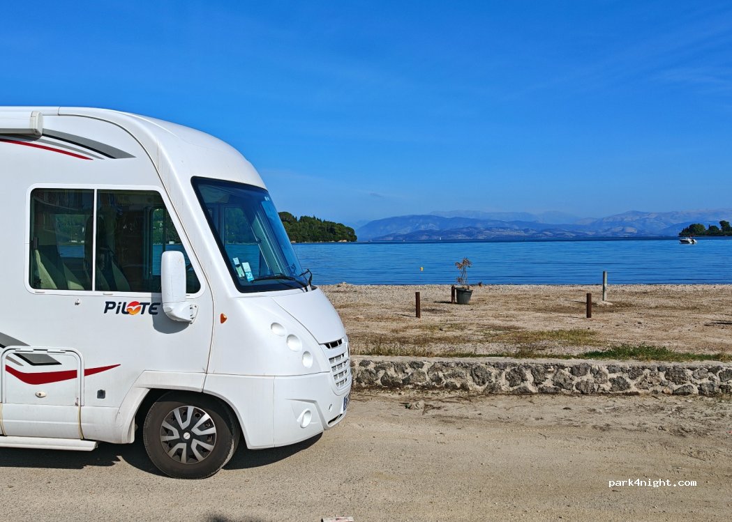 Parking gratuit à la plage de Gouvia. Il y a des poubelles et des bars/restaurants autour. Nous y avons passé une nuit en juin 2023. La nuit 80% de la place de parking était gratuite. Ce n'était pas super calme à cause des jeunes touristes à la plage qui jouaient au volley-ball et buvaient, et le camion d'enlèvement des déchets est arrivé tard dans la nuit. Cela ne nous dérangeait pas, c'est dans une ville après tout. C'est définitivement sûr avec des immeubles d'appartements, des hôtels et des bars autour. Ce n'est sûrement pas le plus bel endroit mais pour une nuit, c'est tout à fait bien, parfait pour passer la nuit après son arrivée à la ville de Corfou (à 15 minutes en voiture du port de Corfou). Très belle vue!