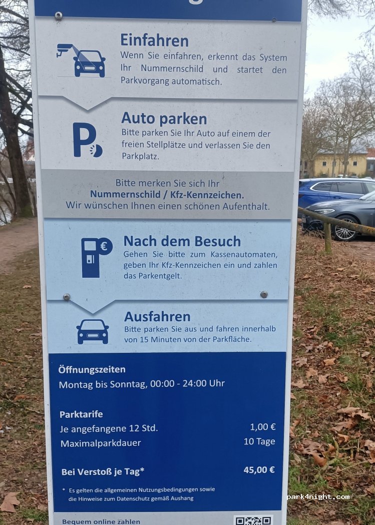 Der Parkplatz ist zentrumsnah und fußläufig ist man in 20 Minuten in der Altstadt. Seit Nov. 2024 darf man bis zu 10 Tagen parken."Unterer Wörth" Kosten 1 Euro pro 12 Stunden,zu bezahlen am Automaten oder per App. Vor Ausfahrt bezahlen ansonsten kann es zu einer Geldstrafe von 45 Euro führen. Es gibt keine Müllbehälter, Frischwasser oder Entsorgungsmöglichkeiten.