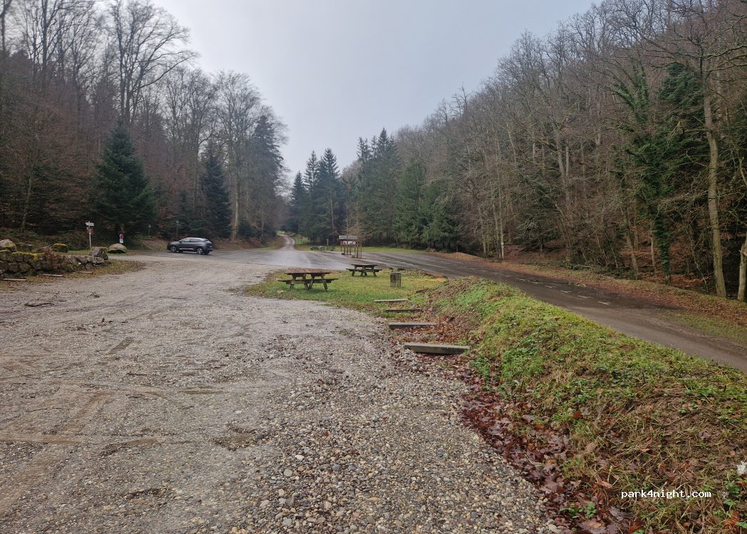 Grand parking en pleine forêt, surface en enrobé mais légèrement en pente. Au même endroit se trouve un espace en gravier plus idéal. Endroit très calme où les enfants peuvent jouer en toute sécurité. Réseau Free 4G sur place. Départ possible pour de nombreuses randonnées très bien indiquées.