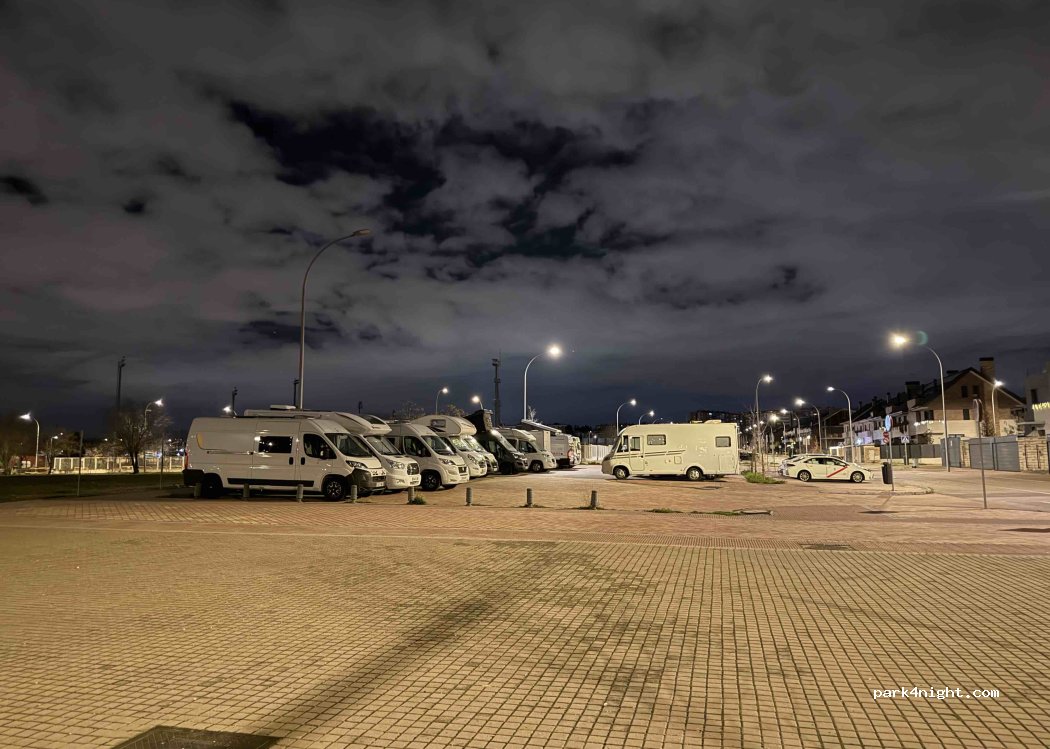 Amplio aparcamiento para pasar la noche,zona muy tranquila en el barrio de vallecas,no tiene ningún servicio salvo algunas papeleras.