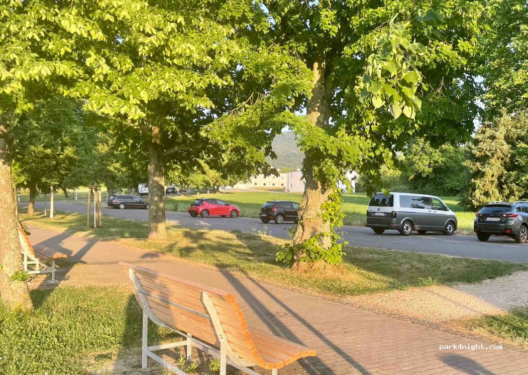 Parking dans un espace vert, bon pour une nuit en transit. Bancs et poubelles à proximité immédiate. Très proche se trouve un bain thermal et les jardins du spa. Un très beau jardin d'exposition de la société Wala se trouve également juste à côté. La rue n'était pas bruyante.