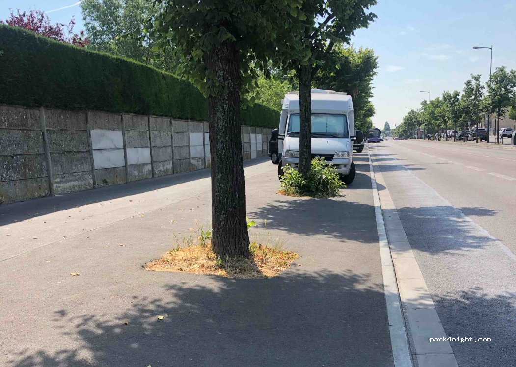 Bon parking hors zone environnementale pour visiter Reims. En vélo 2,8 km de la vieille ville. Les nuitées sont possibles, mais trop bruyantes à cause de la route principale.