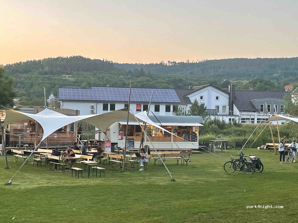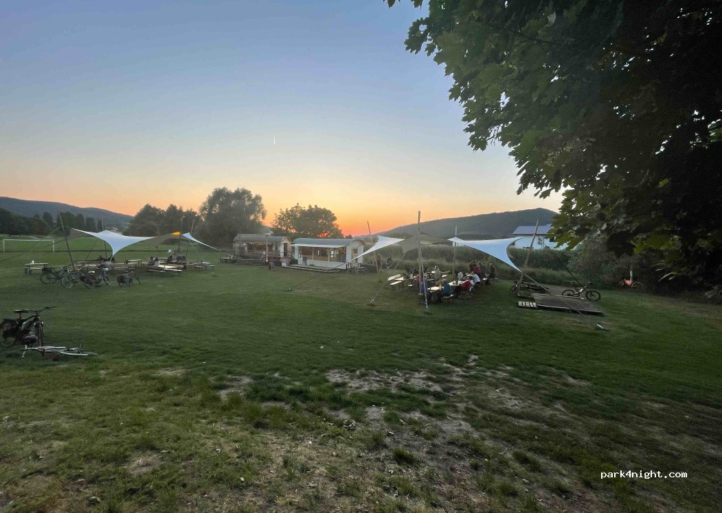 Wir haben dort übernachtet…gegenüber im Sommer Essen und Trinken unter großen Zelt Dächern..preiswert… Toilettenwagen auf dem Radweg… Von 9:00 bis 17:00 kostenpflichtig danach frei.